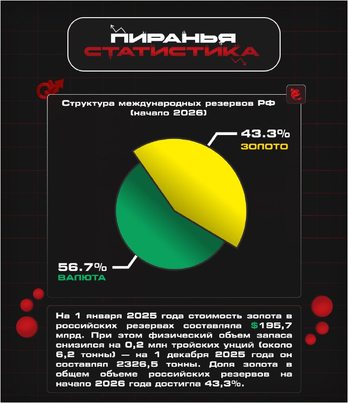 Запас сократился, стоимость выросла: парадокс золотых резервов По состоянию на 1 января 2025 года стоимость золота в российских резервах составляла $195,7 млрд. При этом физический объем запаса снизился на 0,2 млн тройских унций (около 6,2 тонны) — на 1 декабря 2025 года он составлял 2326,5 тонны. Доля золота в общем объеме российских резервов на начало 2026 года достигла 43,3%. 3⃣