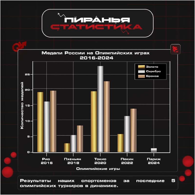 КАК РОССИЯ ВЫСТУПАЛА НА ОЛИМПИЙСКИХ ИГРАХ ЗА ПОСЛЕДНЕЕ ДЕСЯТИЛЕТИЕ? Олимпийские игры в Италии сейчас в самом разгаре и продлятся еще вплоть до конца следующей недели. На этой волне наша редакция предлагает вам вспомнить, каких результатов добивались наши спортсмены за последние 5 олимпийских турниров. Рио 2016 Олимпиада в Рио была для России настоящим испытанием на прочность. После допингового скандала, в условиях высокого морального давления и неопределённости, команда отправилась в Бразилию не в полном составе. Не допустили всю сборную по легкой атлетике, кроме Дарьи Клишиной, которая заняла 9 место по прыжкам в длину. С уверенным золотом по вольной борьбе уехал "Русский танк" Абдулрашид Садулаев, а главному тренеру сборной России по фехтованию Ильгару Мамедову пришлось бриться налысо, ведь он обещал это сделать в случае успеха своих подопечных, которые в итоге выиграли 7 медалей: 4 золотых, 1 серебряную и 2 бронзовых. Пхеньян 2018 Грандиозный успех и золото, на тот момент еще 15-летней, фигуристки Алины Загитовой. Их дуэль с Евгенией Медведевой (2 место) стала украшением турнира. Золото впервые за 26 лет тогда взяла хоккейная сборная под руководством Олега Знарка, победный гол в финале был за Кириллом Капризовым. Целых 8 золотых медалей у команды лыжников Елены Вяльбе, из них 4 только на счету у одного Александра Большунова. Токио 2020 Золото и мужской, и женской команды наших гимнастов в командном многоборье, двойное золото Евгения Рылова в плавании. Первую за 17 лет медаль в академической гребле тогда завоевали Василиса Степанова и Елена Орябинская. Российский тхэквондист Владислав Ларин за пару месяцев до соревнований сломал руку, но это не остановило его взять олимпийское золото. Абдулрашид Садулаев вновь занял 1 место, и уехал с золотом. Пекин 2022 Тройное золото в лыжных гонках завоевал Александр Большунов и торжественно нес знамя на церемонии закрытия. Помимо него в командной эстафете 3 золотых медали: у Сергея Устюгова, Дениса Спицова и Алексея Червоткина. Российские фигуристки Камила Валиева, Анна Щербакова и Александра Трусова заняли весь пьедистал, и хоть у них украли церемонию награждения, успех это никак не уменьшает. Париж 2024 На эти олимпийские игры нашим спортсменам пришлось ехать в нейтральном статусе, ведь МОК запретил России участие. По политическим причинам дорогу на олимпиаду закрыли многим спортсменам, а многие отказались сами из-за отсутствия флага и гимна. Даже в таких условиях удалось увезти медаль — теннисистки Мирра Андреева и Диана Шнайдер завоевали серебро в парном разряде. На Олимпийских играх в Милане сейчас выступают в нейтральном статусе 13 российских спортсменов. Пока они идут без медалей, но олимпиада еще не окончена, и даже в такой невыносимой для спортсменов обстановке, где нет возможности спеть родной гимн и поднять родной флаг, россияне еще скажут свое слово. #Пиранья_Статистика
