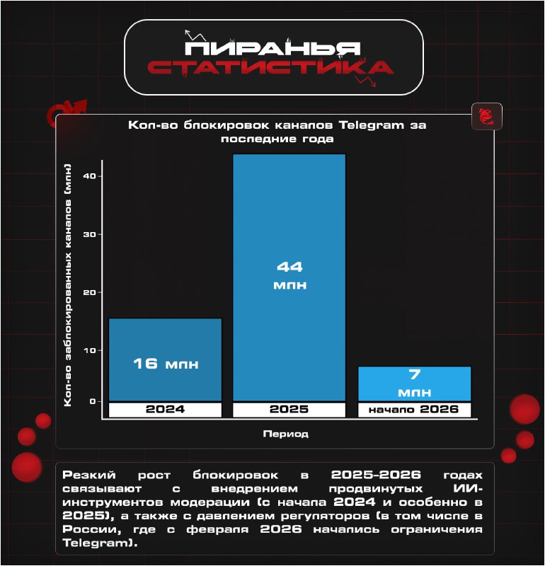 АКТИВНЫЕ СТАРАНИЯ TELEGRAM ПРОТИВ БЛОКИРОВКИ Только за 15 февраля Telegram заблокировал более 200 тыс. каналов за нарушения правил политики платформы. Тем временем, дату полной блокировки Telegram СМИ прогнозируют на 1 апреля. Является ли это разовой "показухой", или же Telegram вполне готов сотрудничать с нашим законодательством, выясняет наша редакция: Картина до замедлений Еще до разговоров о замедлениях и блокировке платформа активно пресекала потоки запрещенной информации. За 2024 год Telegram заблокировал около 16 миллионов каналов и групп. Из них было заблокировано почти 702 тыс. групп, которые содержали материалы по теме сексуального насилия над детьми, а также около 129 тыс. групп и каналов, которые были связаны с терроризмом. В 2025 году платформа заблокировала уже 44 миллиона каналов, что в 2,7 раза больше, чем в 2024 году. Данные говорят о том, что Telegram с каждым годом набирал обороты в плане удаления запрещённого контента. Активное начало года В 2026 году Telegram активизировался еще сильнее, и за период с 1 января по 16 февраля заблокировал больше 7 миллионов каналов. Больше полумиллиона каналов были отправлены в блок только за новогодние сутки (с 31 декабря по 1 января). Начиная с прошлой недели, практически с начала замедлений и первых крупных сбоев Telegram, было зафиксировано больше миллиона заблокированных каналов. При этом позиция РКН по Telegram не изменилась, даже после сообщений о том, что платформа поддерживает диалог с ведомством. Говоря о конкретных претензиях, речь идет об условном списке материалов, которые Роскомнадзор просит удалить, но их часть до сих пор не удалена. Кто больше готов сотрудничать? Если сравнить ситуацию у Google и Telegram, то можно проследить, что в отличие от Google, который набрал около 33 миллиарда оборотных штрафов в России за неудаление запрещенного контента, Telegram проявляет себя как платформа, готовая выполнять требования, и при этом действовать быстро. Более того, представительство Telegram поддерживает контакт с Роскомнадзором, в отличие от того же WhatsApp* (принадлежит Meta, признанной экстремистской и запрещенной в РФ). Сообщалось, что никаких действий и ответов на претензии от американского мессенджера не наблюдалось, и их домен недавно пропал с DNS-cерверов РКН, что позволяет полностью закрыть доступ к сервису на территории РФ. Роскомнадзор пока не дает точной и конкретной информации насчет полной блокировки Telegram . По словам депутата Андрея Свинцова у платформы есть все возможности продолжить работать в России, если она откроет юридическое лицо в РФ, заключит здесь договоры с центрами хранения и обработки данных, и будет платить налоги в бюджет России. Последнее требование здесь — оперативное удаление запрещенного контента, чем Telegram уже активно занимается.