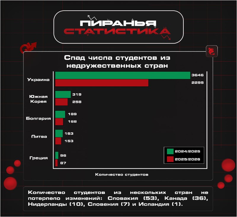 ДИНАМИКА СТУДЕНЧЕСКОЙ МИГРАЦИИ По данным за последний год в российских вузах наблюдался рост числа студентов из нескольких недружественных стран. Из каких государств все еще ездят учиться в Россию, а где наоборот наблюдается отрицательная динамика, расскажет и покажет наша редакция: Недружественные страны Список иностранных государств, которые, согласно официальной позиции Правительства РФ, совершают против России недружественные действия. На страны из этого списка накладываются ограничения. По состоянию на данный момент в этот перечень входит 49 государств. Динамика стран Балтии В Латвии и Эстонии людям русской национальности трудно получить образование на родном языке. Их доля в этих странах составляет 23% и 22% соответственно. В 2024/25 учебном году в российских вузах училось 605 студентов с латвийским гражданством и 363 с эстонским. В 2025/26 учебном году их число выросло до 615 и 380 соответственно. Есть мнение, что положительная динамика, помимо русских, сохраняется из-за латышей и эстонцев, которые хорошо владеют русским языком. При этом, третья прибалтийская страна наоборот показала спад: число студентов из Литвы упало со 163 до 153 . Картина по Европе Помимо стран Балтии наблюдается рост числа студентов из Кипра (с 37 до 41) , а также из Румынии (с 15 до 24) , которые также могут быть гражданами Молдавии, включая непризнанное Приднестровье, у которых кроме молдавского часто есть российский и румынский паспорта. Большой спад наблюдается у студентов из Украины. Если в прошлом учебном году их было 3646 , то в этом их число упало до 2295 . Заметный спад также показали Болгария (со 189 до 168) , Греция (с 96 до 87) и Италия (с 86 до 81) . Внушительное число студентов в российских вузах есть и из Германии, которое в этом году незначительно уменьшилось с 208 до 207 . Остальной мир Если в прошлом учебном году в российских вузах было 319 студентов из Южной Кореи, то в этом их число уменьшилось до 258 . Также спад и у Японии: с 75 до 61 , а отток из США по сравнению с прошлым годом уже оказался не очень большим: было 100 , стало 97 . На одного студента больше приехало из Новой Зеландии, теперь их 3 . Несмотря на санкции, с Южной Кореей и Японией у нас до сих пор силен взаимный интерес к культуре. Как утверждают эксперты, из этих стран едут в основном учиться по гуманитарным направлениям. Общее количество студентов из недружественных государств по сравнению с 24/25 учебным годом упало почти на четверть — с 6521 до 4983 человек. Тем не менее, сотрудничество в сфере образование между странами все еще сохраняется , к тому же президент России Владимир Путин поставил задачу довести количество иностранных студентов до полумиллиона к 2030 году . #Пиранья_статистика