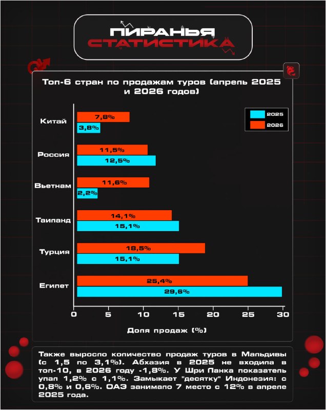 миллиардов долларов. Также ожидается, что возникшие негативные настроения туристов касательно отдыха в Персидском заливе сохранятся и после окончания военных действий. Перераспределение спроса Военные действия на Ближнем Востоке практически лишили ОАЭ части туристов. В 2025 году страна занимала 12% рынка туров, а теперь полностью выпала из структуры продаж. Поток туристов перераспределился в Турцию, Вьетнам, Китай и отчасти, Абхазию (бюджетный сегмент) и Мальдивы (премиальный сегмент). Мальдивы за год удвоили свою долю в продажах (с 1,5% до 3,1% ), практически та же ситуация у Китая (с 3,8% до 7,8% ). Оба направления выиграли от оттока туристов из ОАЭ. Несмотря на значительное снижение, лидером продаж остается Египет (с 29,6% до 25,4% ). 2 место за Турцией (с 15,1% до 18,5% ), а тройку лидеров замыкает Таиланд (с 15,1% до 14,1% ). Картина запросов Доля поисков туров в Турцию выросла с 18,8% до 22,8% , что говорит о высоком интересе, который уже отчасти отразился на количестве продаж. Турция обогнала Таиланд по заинтересованности пользователей и, приблизившись к Египту, заняла 2 место. Значительно больше стали интересоваться турами во Вьетнам (с 3,7% до 10,0% ), что также соответствует его динамике в продажах. В свою очередь интерес к Китаю растет существенно быстрее, чем продажи (с 3,5% до 8,4% ). Россия осталась в пятерке лидеров , несмотря на небольшое снижение продаж (с 12,5% до 11,5%). К тому же доля России в поисках туров на апрель выросла с 4,7% до 6,4% . Можно сделать вывод, что даже при росте выездного потока спрос туристов на отдых внутри страны сохраняется на высоком уровне. #Пиранья_статистика