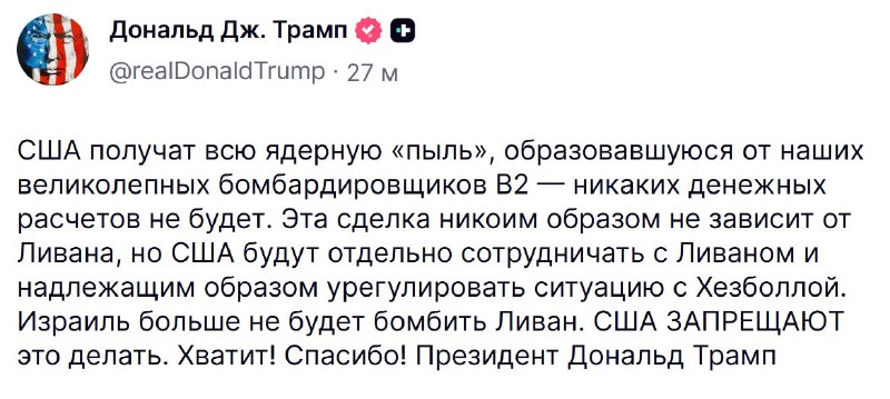 Пиранья17.04.2026Израиль больше не будет бомбить Ливан. США запрещают...Израиль больше не будет бомбить Ливан. США запрещают это делать. Хватит! Спасибо , — Трамп.