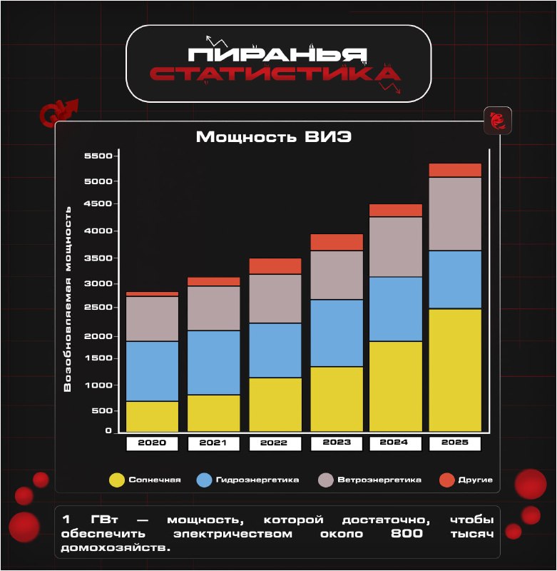 Чтобы удержать климат в рамках этих целей, то есть ограничить потепление, миру нужно добавлять минимум 1 000–1 200 ГВт в год уже сейчас, а дальше ещё быстрее. #Пиранья_статистика