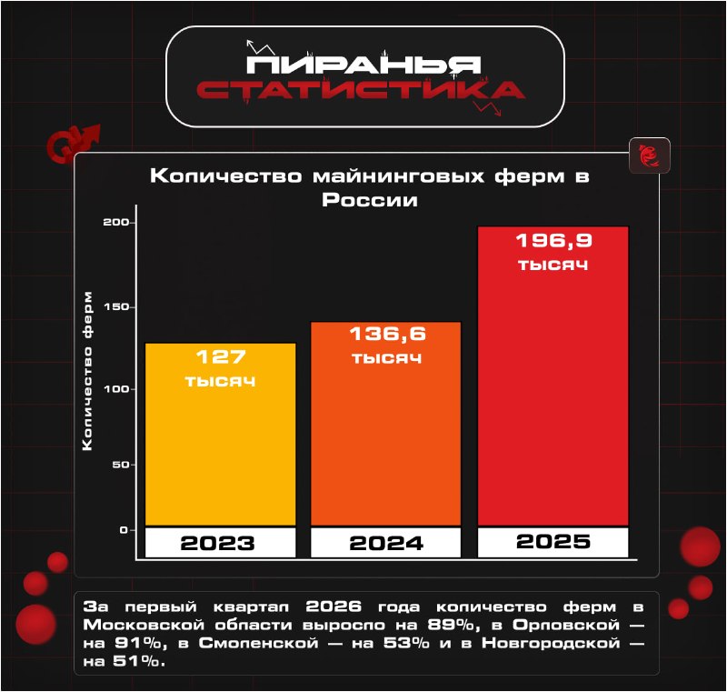 EH/s ). В 2025 году число майнинговых ферм в РФ достигло 196,9 тысяч , в то время как в 2024 году их количество насчитывало 136,6 тысяч . Совокупная мощность всех уникальных установок превысила 11 ГВт . В первой половине 2025 года хешрейт России увеличился со 125 EH/s до 150 EH/s , и за весь год было добыто около 26 000 BTC (примерно $2,2 млрд ). На добычу биткоина приходится 2% потребления всей электроэнергии в России. Из-за низких цен на электроэнергию добытчики криптовалюты сконцентрировались в Сибири. Главный центр майнинга - Иркутская область, общая майнинговая нагрузка в которой оценивалась в 1,066 ГВт . Также больше количество ферм было зафиксировано в Новосибирской области и Башкортостане. Согласно исследованиям, самым выгодным местом для майнинга в 2025 году была Республика Хакасия, где содержание одной майнинг-машины со средним потреблением около 2,2 тысяч кВт·ч в месяц обходилось примерно в 56 тысяч рублей в год. По итогам 2025 года налоги российских майнеров достигли 567 млн рублей, из которых 84 млн рублей - налог на доходы физ.лиц, а 483 млн рублей - налог на прибыль. В 2026 году в Центральной России и в регионах Северо-Запада был зафиксирован наибольший рост числа майнинговых ферм. В Ленинградской области их количество увеличилось в 2,4 раза, в Тульской области в 2,1 раза. За второй квартал 2026 года первое место среди всех стран -"майнеров" заняли Соединенные Штаты. Их доля составляет 37,4 % глобального хешрейта (примерно 375 EH/s). Несмотря на тезис, что будущее добычи биткоина в Латинской Америке, пока главный центр майнинга находится здесь. Все это благодаря большому количеству профессиональных ферм, дешёвой энергии в некоторых штатах (особенно в Техасе) и сильным институциональным компаниям. Китай идет на третьем месте с 12 % (примерно 125 EH/s). Несмотря на официальный запрет, майнинг там продолжается в «серой» зоне — через подпольные и полулегальные операции. Объединённые Арабские Эмираты (ОАЭ) и Оман разделили пятое место с долей 3,0 % (около 30 EH/s ). Майнинговые установки, связанные с королевской семьёй ОАЭ, производят примерно 4 BTC в день.