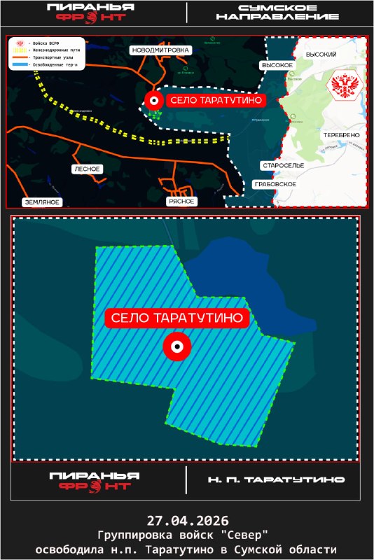 Российские войска установили контроль над населенным пунктом Таратутино в Сумской области. Также освобождена Ильичовка в Донецкой Народной Республике.